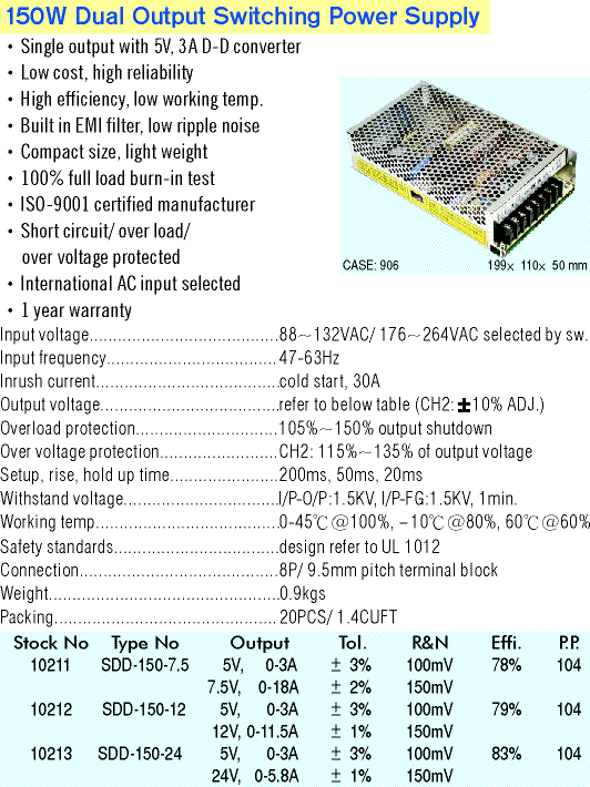 | SDD-150-7.5 | 10211 | +7.5V 18A & D-D +5V 3A 199x110x50mm | |||||||